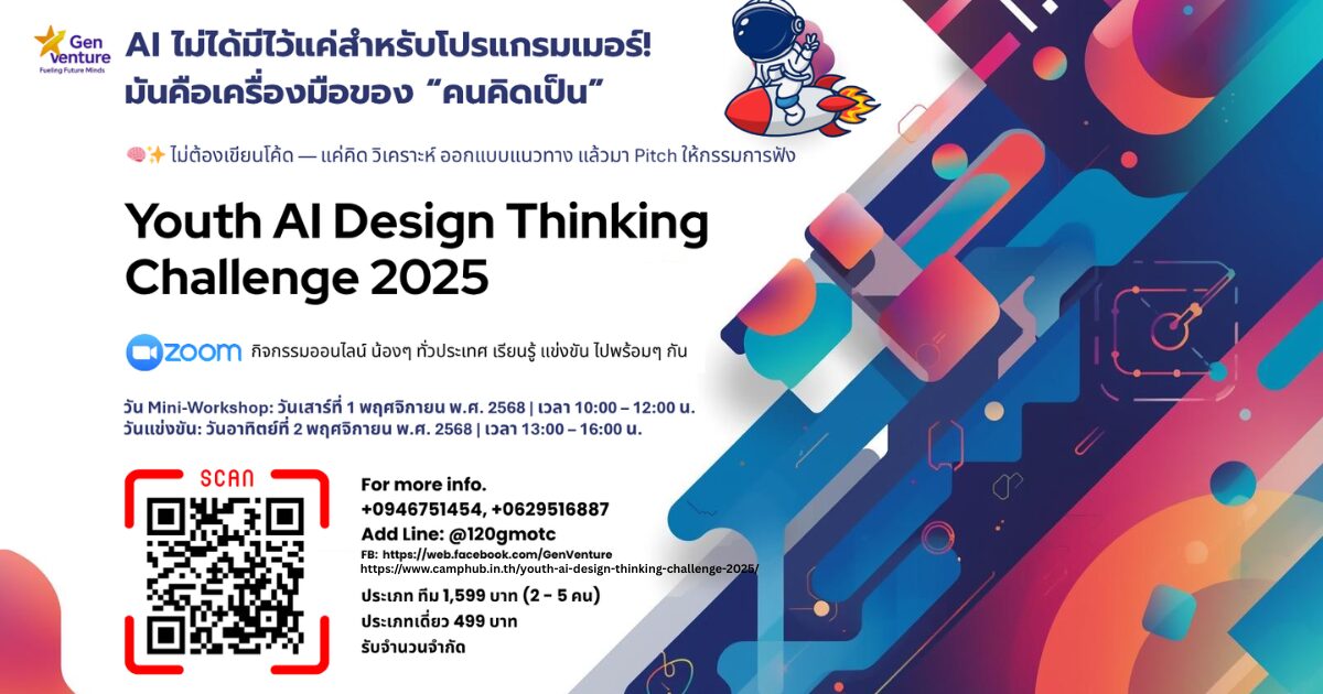Gen Venture จึงจัดกิจกรรม Youth AI Design Thinking Challenge 2025 สำหรับน้องๆ มัธยมปลาย เพื่อฝึกทักษะการคิดเชิงออกแบบ (Design Thinking) ผสานกับการใช้ AI ในการแก้ปัญหาจริง พร้อมทั้งสร้างผลงานที่สามารถนำไปใส่ Portfolio ใช้ยื่นเข้ามหาวิทยาลัย ทั้งในและต่างประเทศ