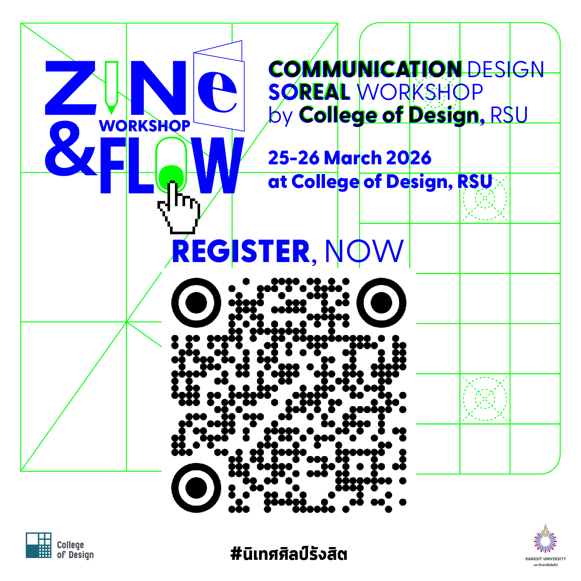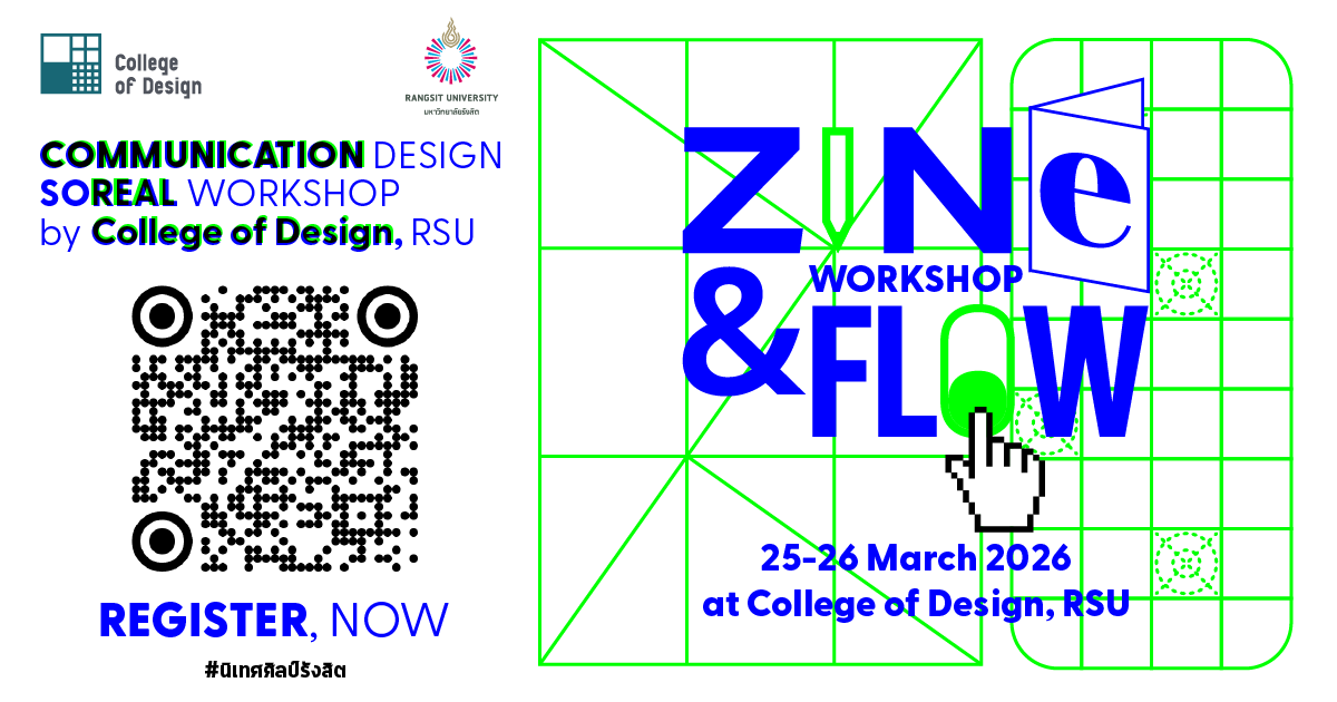 SoReal Workshop 2026 สาขาการออกแบบนิเทศศิลป์ วิทยาลัยการออกแบบ มหาวิทยาลัยรังสิต ขอเชิญน้องมัธยมปลายและปวช. มาร่วมเรียนรู้การออกแบบการสื่อสารอย่างสร้างสรรค์ กับ 2 เวิร์คช็อปมันส์ๆ ในวันพุธที่ 25 และวันพฤหัสบดีที่ 26 มีนาคม 2569